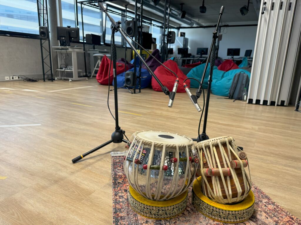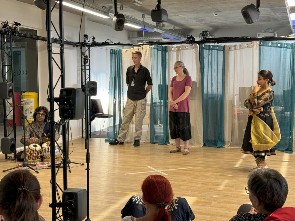 Kathak dancer Sumedha Bhattacharyya and Tabla player Haider Khan performed in a traditional setting, with the audience seated on cushions on the floor. The performance highlighted their synchronization, captivating the audience with their harmonious interplay. Through this experiment, KUG and IT:U want to study the interaction between the Kathak dancer and the Tabla player.