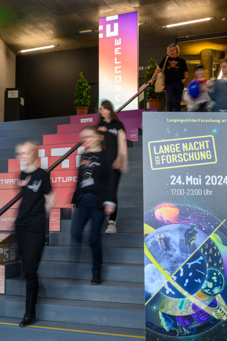 Wow, what a night! On 24 May, 980 visitors took the opportunity to visit the IT:U Interdisciplinary Transformation University Austria and explore several exciting stations: A fictitious disaster exercise, which had to be mastered using VR goggles, was particularly popular that evening. Another highlight: an AI station where books could be scanned and the protagonists of the books asked questions about the story.