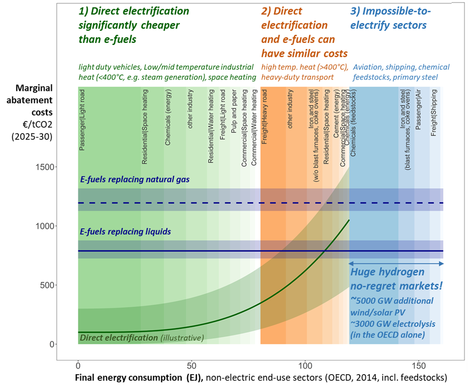 In some cases, direct electrification could be supplemented by hydrogen and, potentially, e-fuels in niche roles, such as long-haul heavy-duty trucking and selected very high-temperature industrial processes. - Large “no-regret” markets where electrification faces hard limits (blue area)