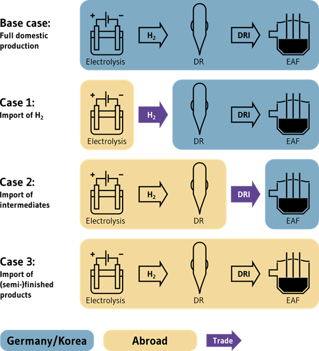 - a base case configuration, where production remains in renewable-constrained regions (e.g., Germany, South Korea, Japan), with