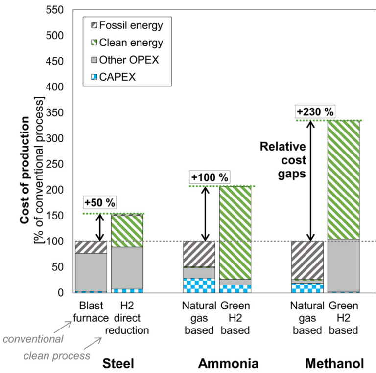 Using a relatively simple, generic TEA, we compare production costs for green steel, green ethylene (for plastics), and green ammonia and urea (for fertilisers) across alternative value-chain configurations. We contrast: