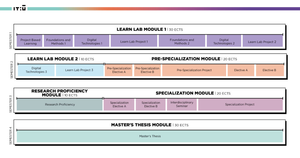 The Learn Lab modules in the first two semesters will give you the opportunity to get to know the six different labs – Virtual Reality, Motion Capture, Maker Lab, Robotic, Interaction and Data Lab – that form the basis of IT:U’s project-based, personalized learning approach. The Pre-Specialization module in the second semester will equip you with the basic skills of your chosen specialization. Your third semester consists of a Research Proficiency module where you’ll be trained in scientific writing and academic methodology. In the Specialization module, you will focus on real-world challenges and projects related to your specialization. The final part of your master’s program is the writing and defence of your master’s Thesis.